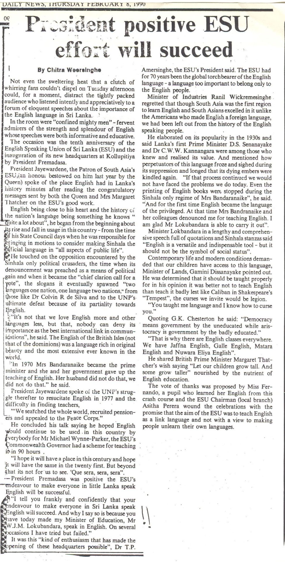 CO-FOUNDER and CHAIRMAN of ESU of SRI LANKA (with Dr Terence Amerasingh)19/2/84 Sri Lanka Sunday Observer